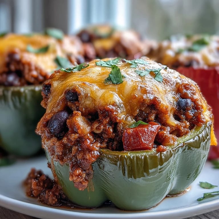 There's something almost meditative about assembling these peppers once your filling is done. The recipe asks for maybe twenty minutes of active work—chopping, browning, simmering—and then the oven handles the heavy lifting while you can actually sit down. It's the opposite of a recipe that demands constant attention; you make the filling, stuff the peppers, and you're essentially done.