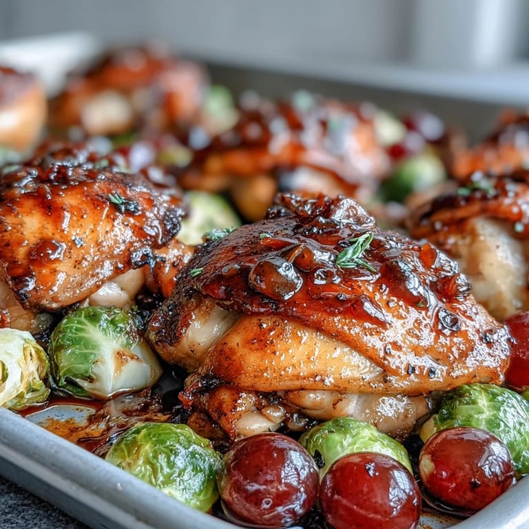 Save There's something almost magical about opening the oven to find chicken thighs nestled among caramelized Brussels sprouts and burst grapes, all glistening under a glossy balsamic glaze. I discovered this combination by accident one autumn evening when I had grapes that needed using and Brussels sprouts from the farmers market calling out for something more interesting than the usual roast. The balsamic vinegar seemed like an odd choice at first, but the way it catches the sweetness of the grapes and the earthiness of the sprouts creates this unexpected harmony that feels both elegant and completely effortless. Now I make it whenever I want dinner to feel a little less ordinary without spending hours in the kitchen.