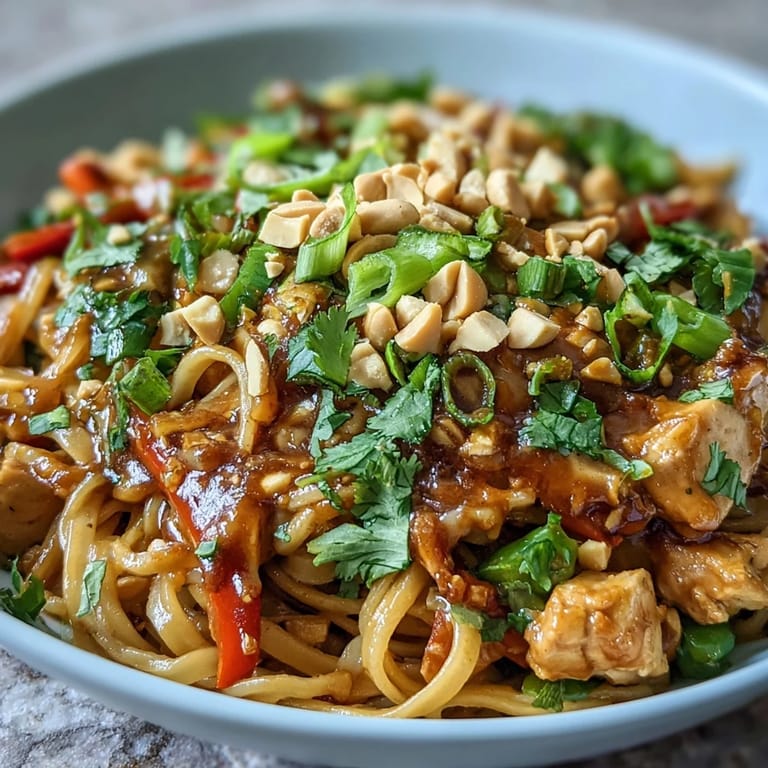 Save One Tuesday evening, my neighbor knocked on my door with a container of mysterious noodles and said, "Try this—I made it in one pan." That first bite changed how I thought about weeknight cooking. The creamy peanut sauce clung to every strand, the chicken was tender, and somehow all those fresh vegetables stayed crisp instead of turning mushy. I spent the next week pestering her for the technique, and now this Thai-inspired bowl has become my answer to the question, "What's for dinner?"