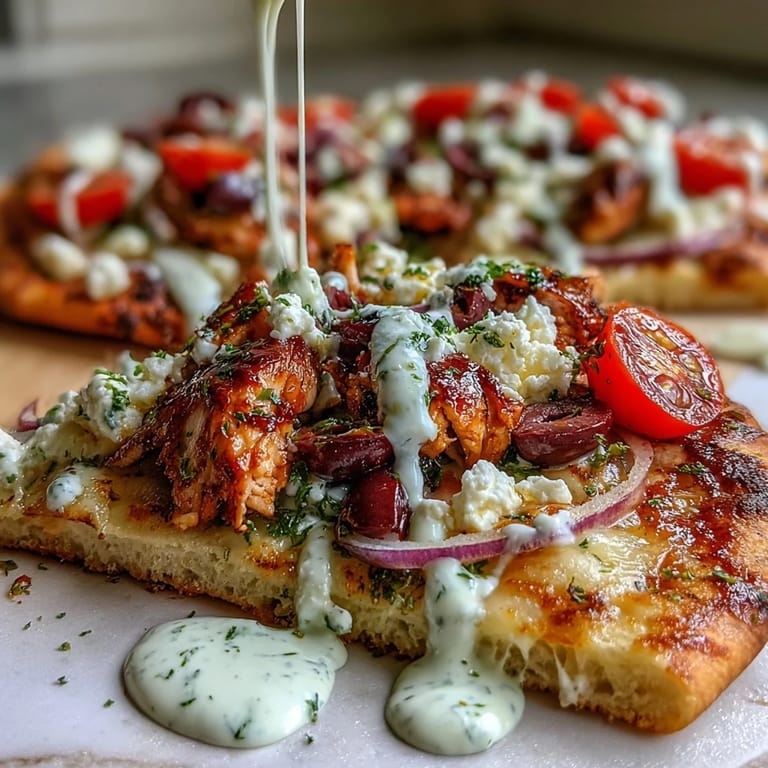- Pull your pizzas from the oven and immediately drizzle each one generously with tzatziki, letting it pool slightly in the warmest spots. Sprinkle with fresh dill or parsley if you have it, then slice and serve while everything is still steaming.