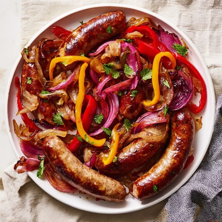 For extra flavor, add sliced garlic or a splash of balsamic vinegar before roasting. Swap sausages for chicken or turkey sausage for a lighter option. Pairs well with a crisp Italian white wine such as Pinot Grigio.