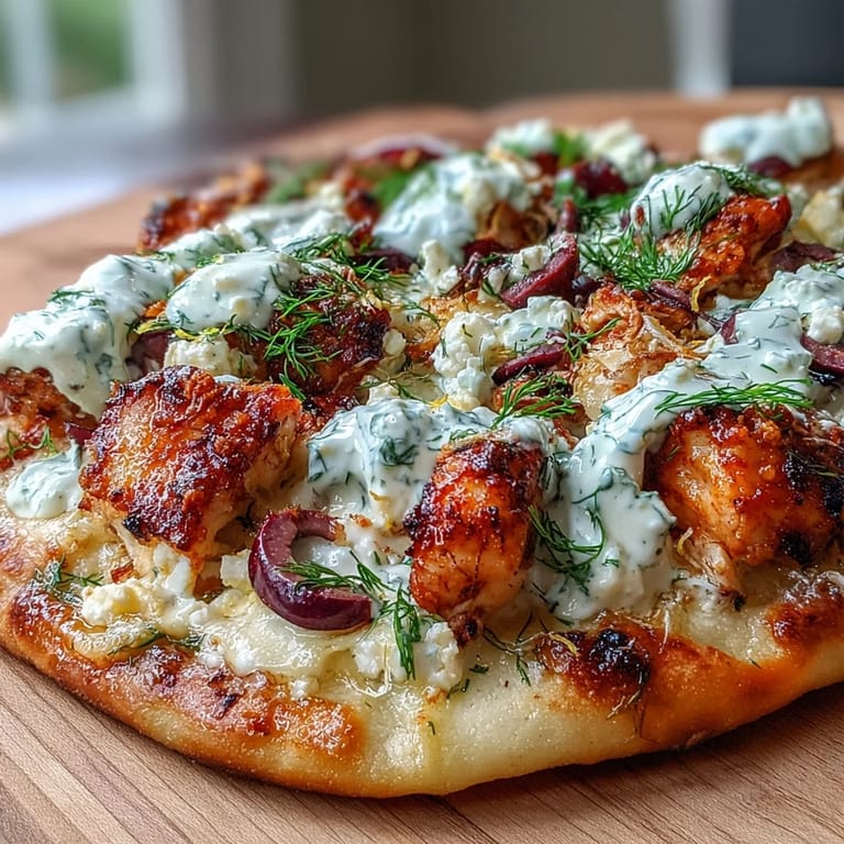 Save Experience the bright and refreshing flavors of the Mediterranean with this Lemon Feta Chicken Naan Pizza. This vibrant fusion dish features tender Greek lemon-marinated chicken, creamy feta, and briny olives baked on pillowy naan, all finished with a cooling tzatziki drizzle for a perfect weeknight meal.
